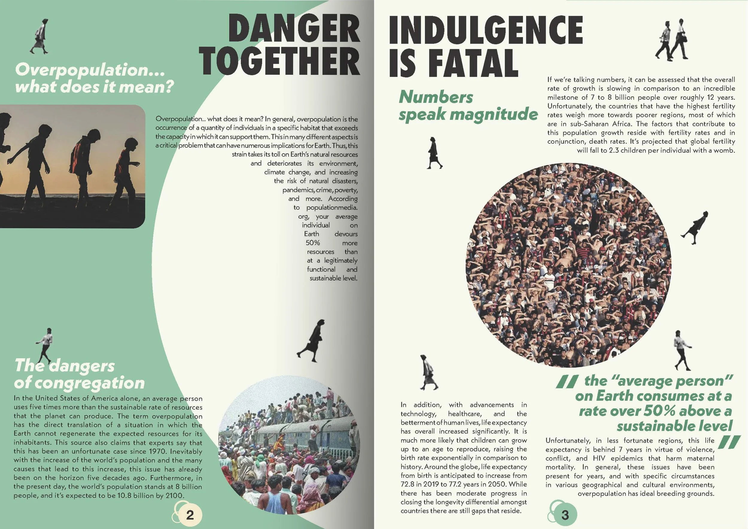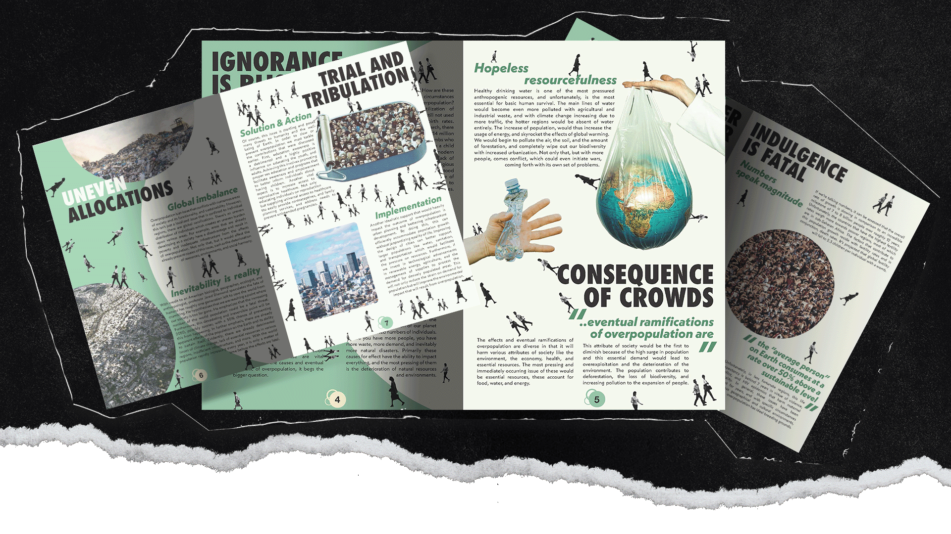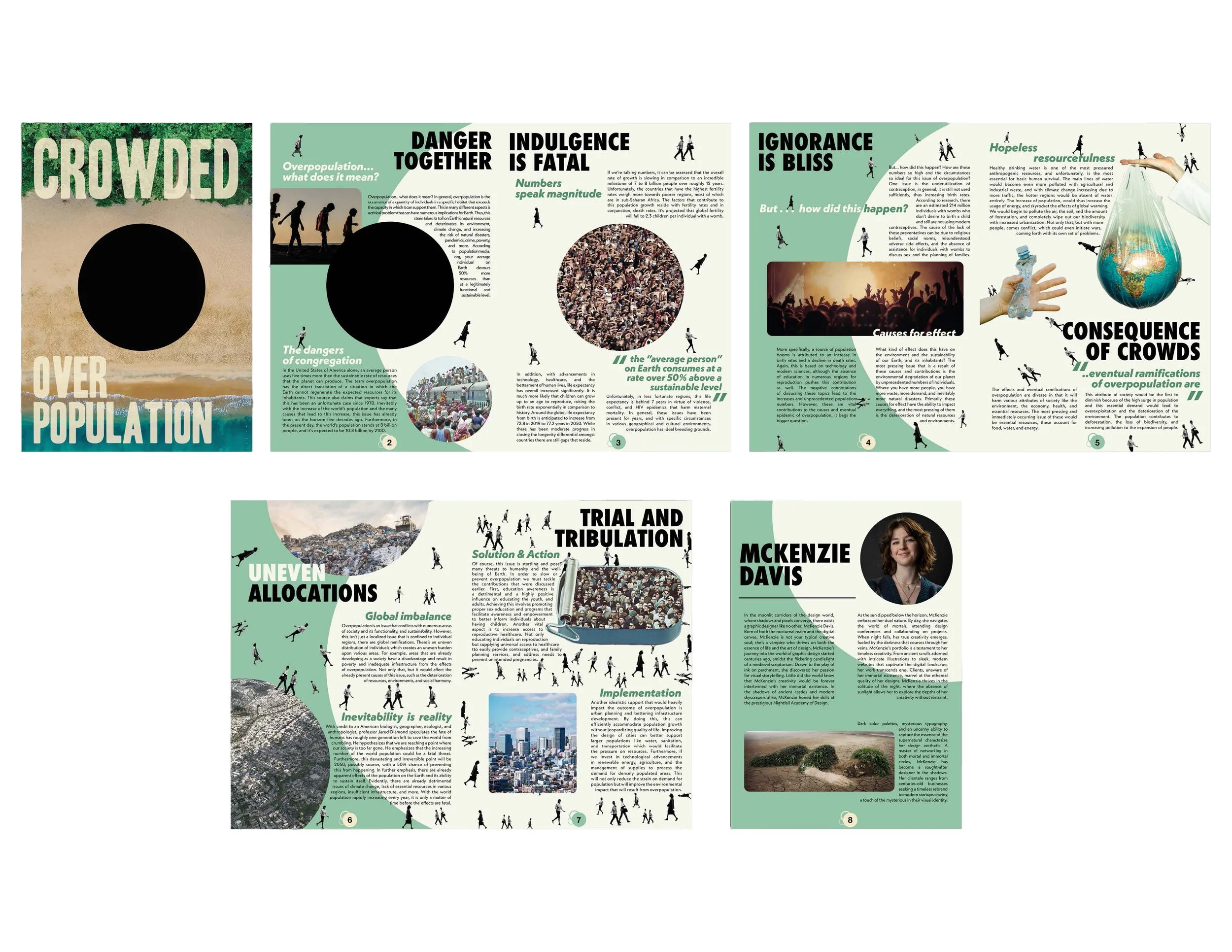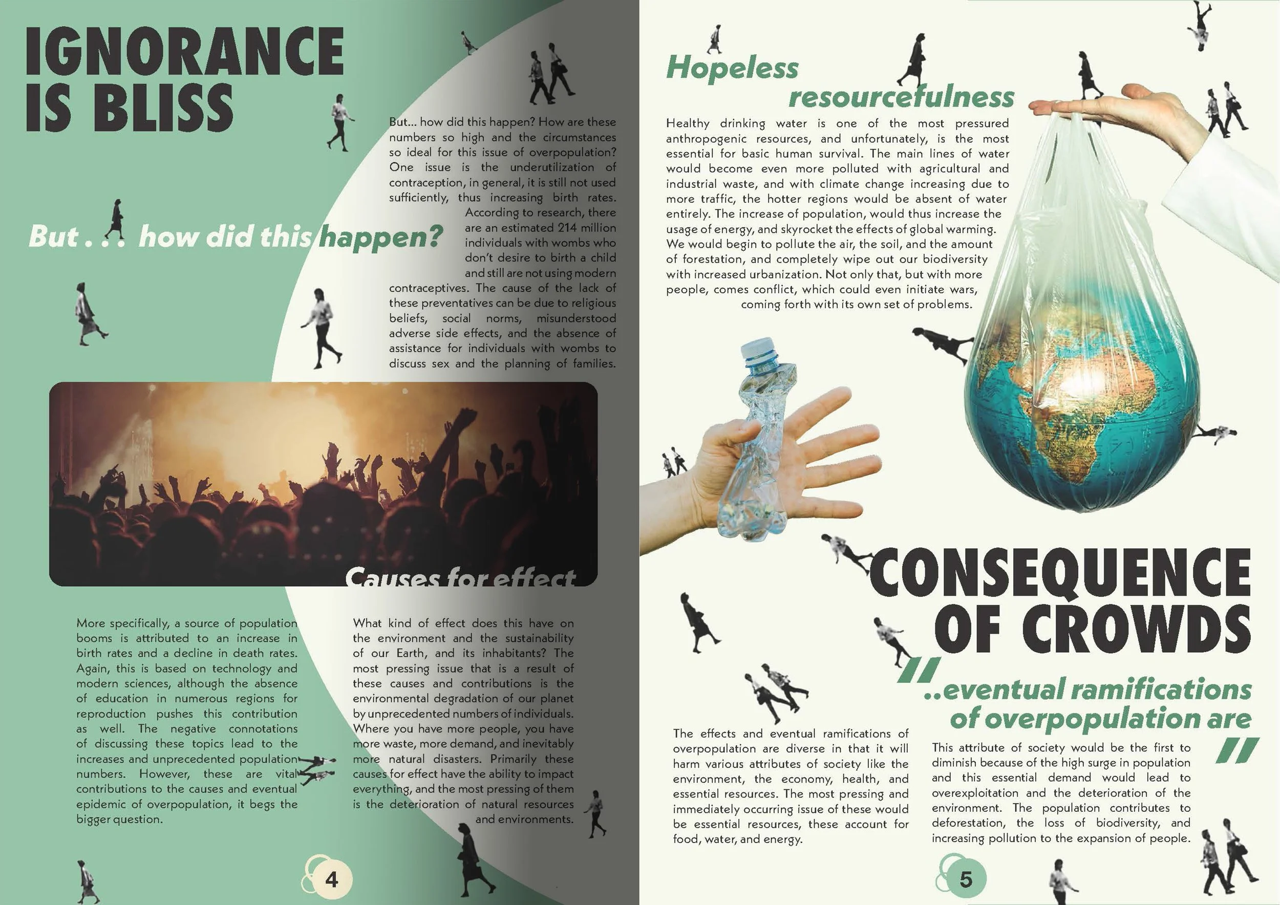 For the diecut, I chose the simplest shape, a circle, which goes through the cover and of course the first page which are indicated by the black circles, to reveal the crowded circular photo on page 3. As I strenuously researched overpopulation and its dangers, its believers and nonbelievers of the issue, and the threat of its arrival, I strove for this situation to not be overlooked. Unlike the individuals who question the validity of this environmental issue, I brought it to light with detailed paragraphs regarding the who, what, when, and where. Although paragraphs don’t particularly press the audience on the surface, I included elements to help illustrate this issue visually. I did this by increasing the stress of the reader by having an increasing number of people present as the pages progress. As well as a circle element to instill a feeling of impending doom, hence the severity of the issue.